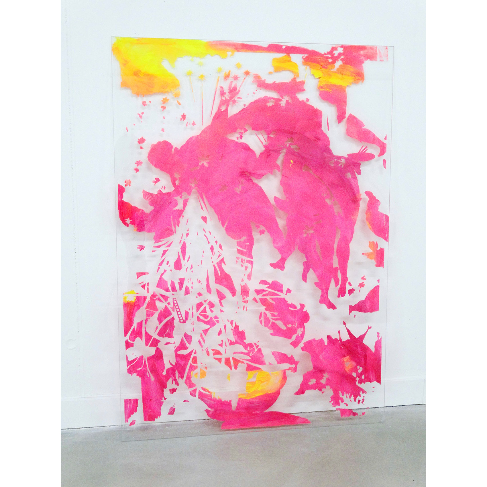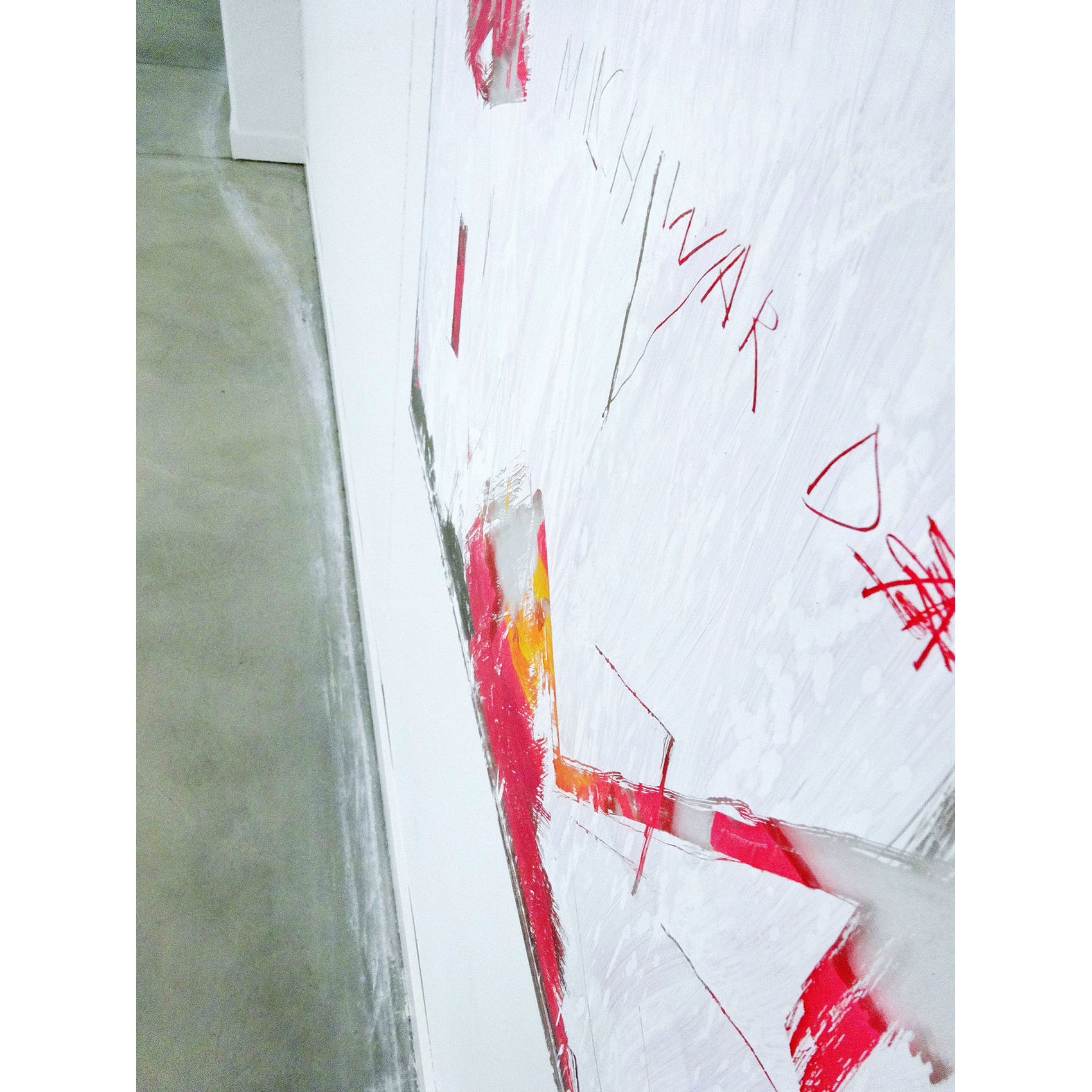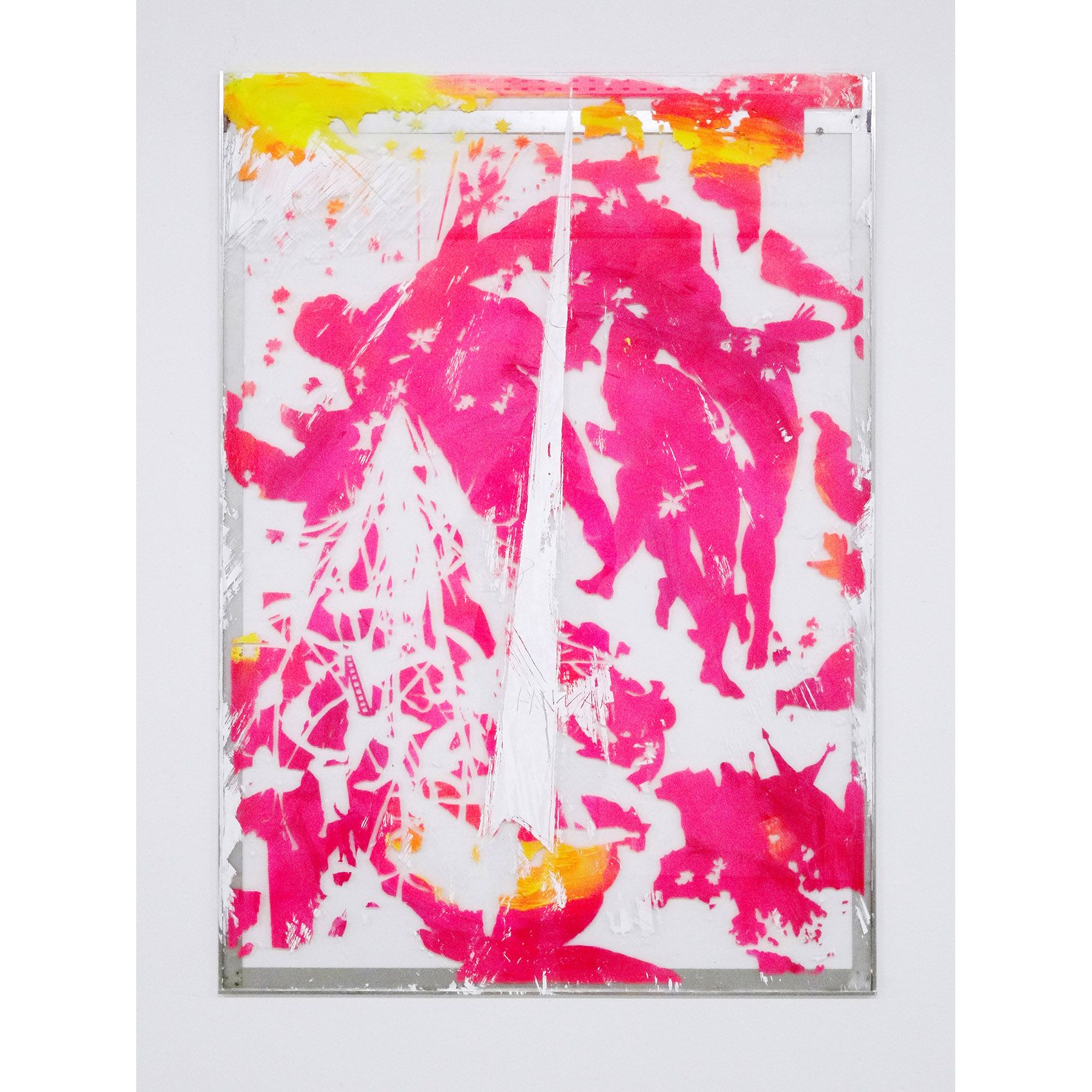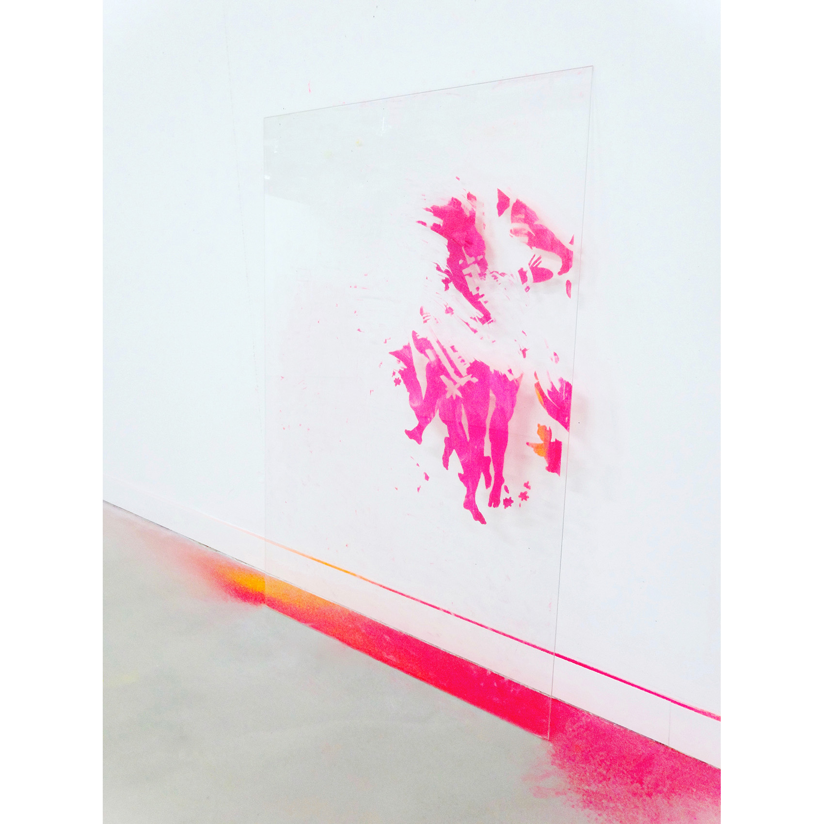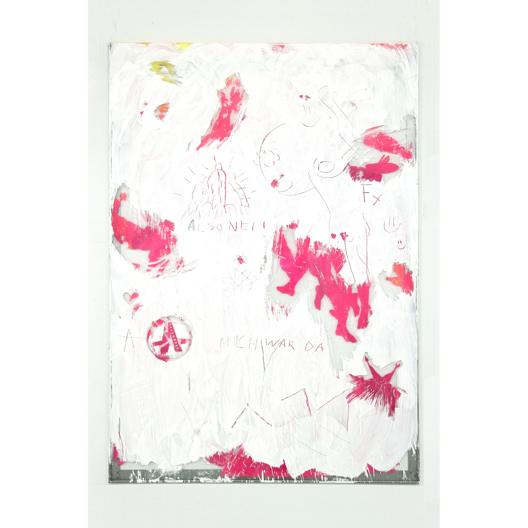 Milchstrasse und Kunst: Eine partizipative Arbeit an der Zürcher Hochschule der Künste. Vorgegeben war ein Glasrahmen für ein Bild in Plakatformat in einem Durchgangsbereich. Auf die Hinterseite des Glases sind Motive gemalt nach der «Entstehung der Milchstrasse» von Tintoretto, kombiniert mit Figuren eines Kupferstichs von J. Harmensz Müller: «Die Künste fliehen vor den Barbaren in den Olymp». Durch Abkratzen der weissen Deckschicht auf der Vorderseite des Glases konnte das hintere Bild sichtbar gemacht werden. Der Farbstaub am Boden stammt von der Befreiung des Glases vom hinteren Bild als letzte Aktion.