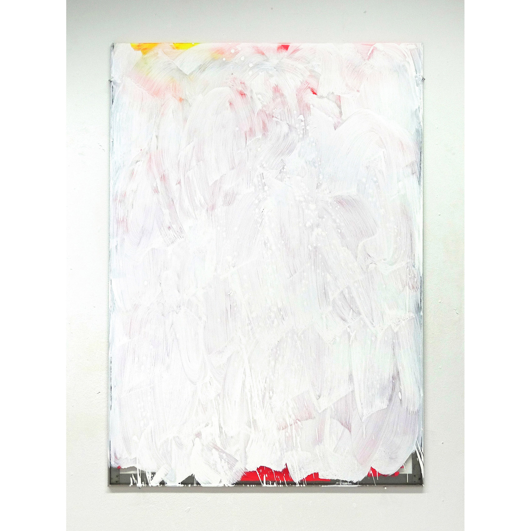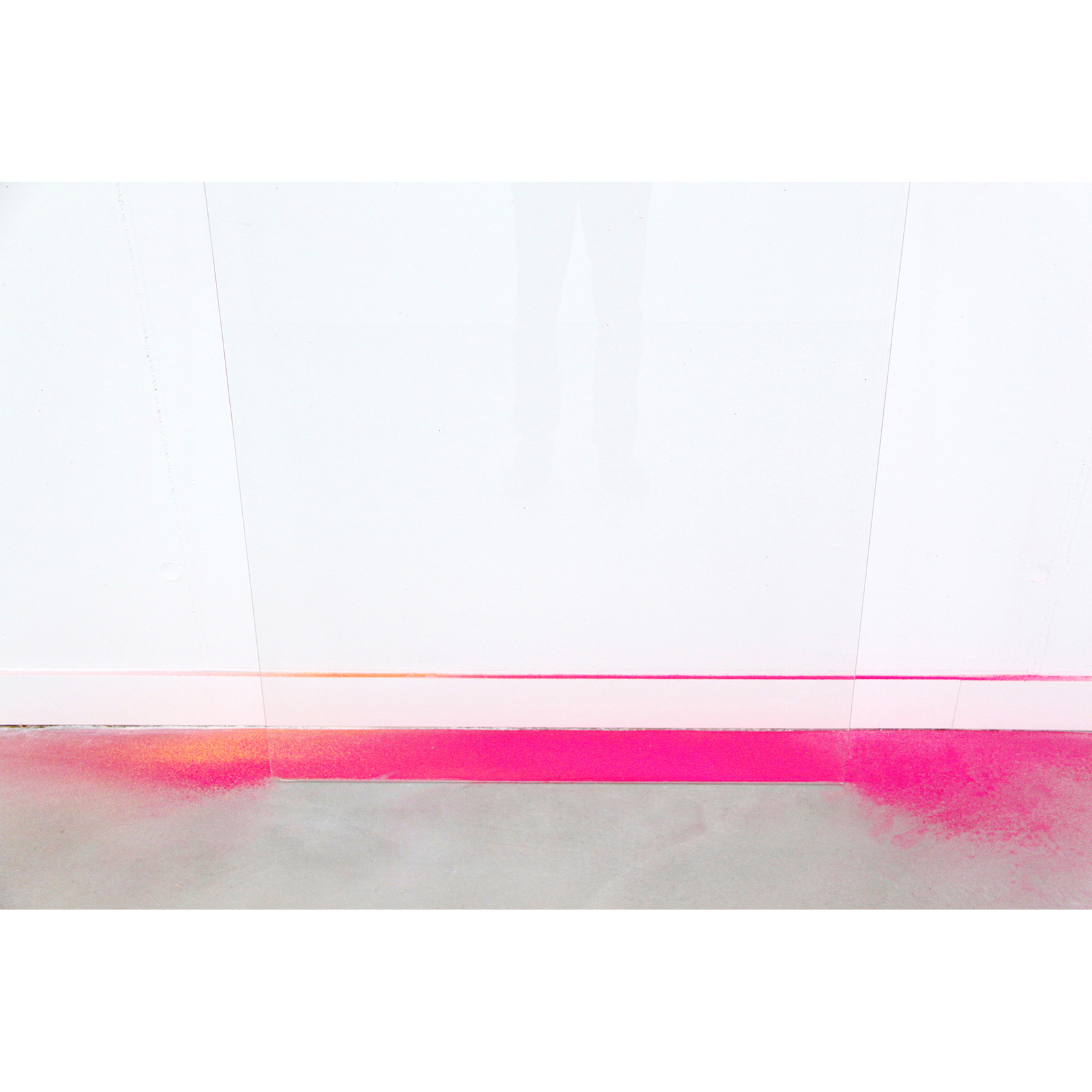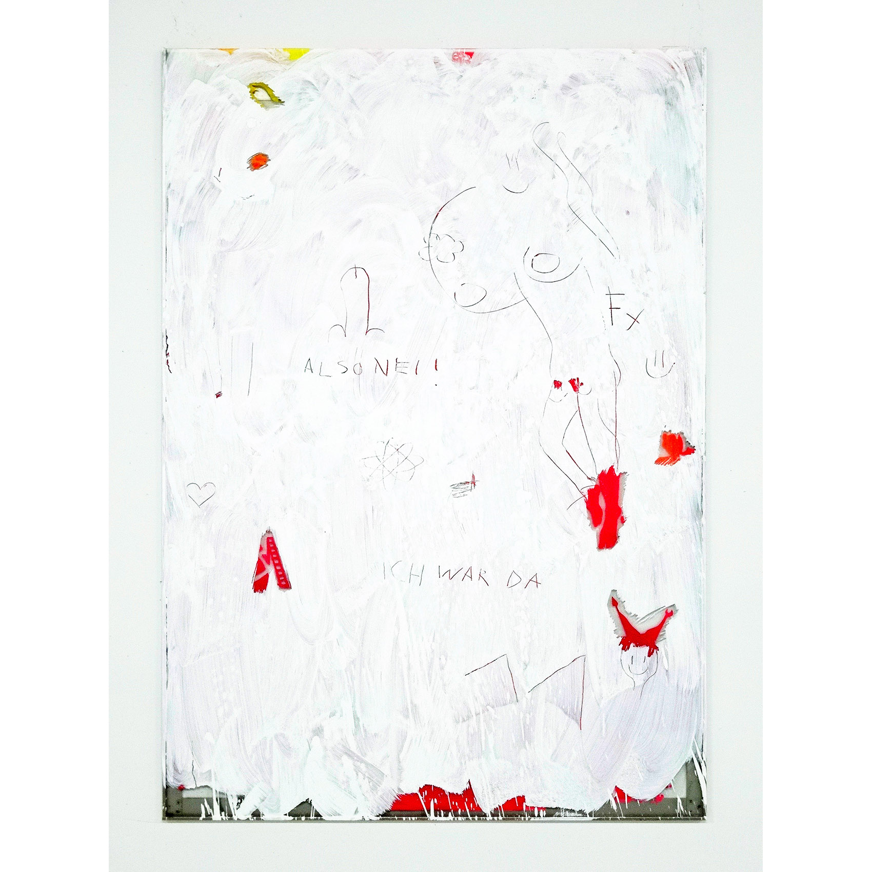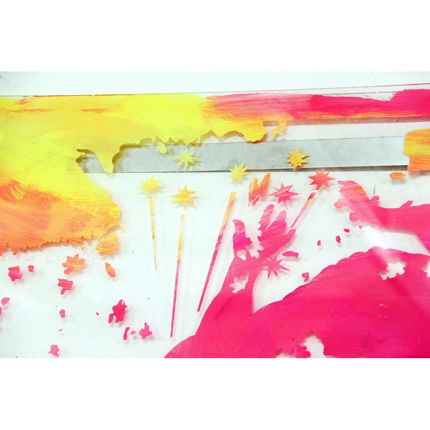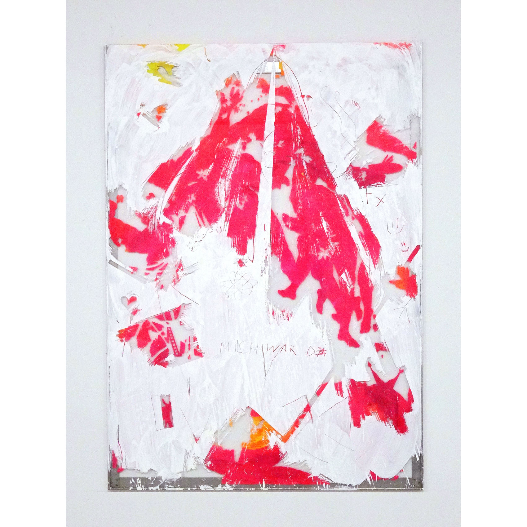 Milchstrasse und Kunst: Eine partizipative Arbeit an der Zürcher Hochschule der Künste. Vorgegeben war ein Glasrahmen für ein Bild in Plakatformat in einem Durchgangsbereich. Auf die Hinterseite des Glases sind Motive gemalt nach der «Entstehung der Milchstrasse» von Tintoretto, kombiniert mit Figuren eines Kupferstichs von J. Harmensz Müller: «Die Künste fliehen vor den Barbaren in den Olymp». Durch Abkratzen der weissen Deckschicht auf der Vorderseite des Glases konnte das hintere Bild sichtbar gemacht werden. Der Farbstaub am Boden stammt von der Befreiung des Glases vom hinteren Bild als letzte Aktion.
